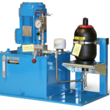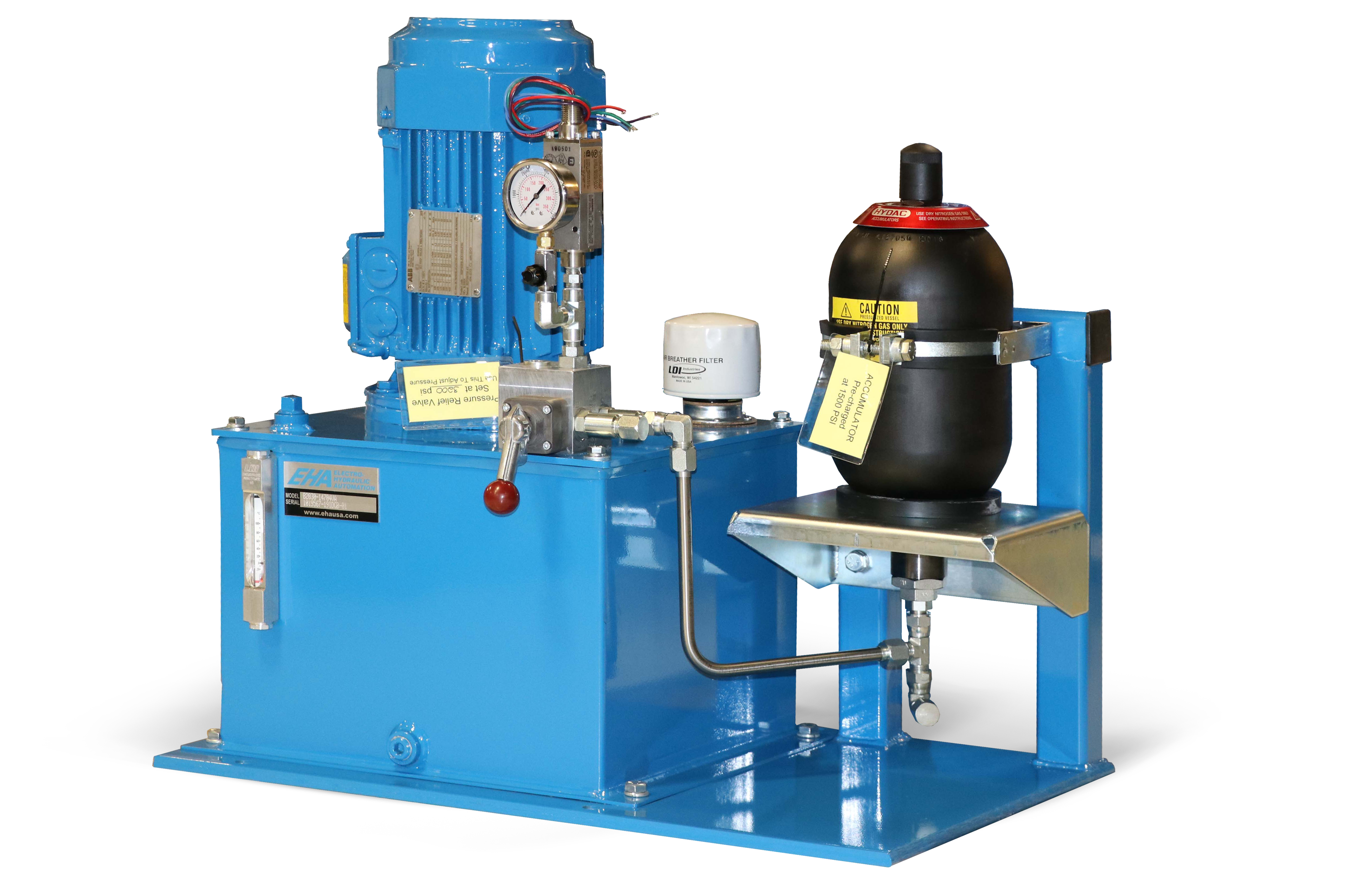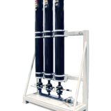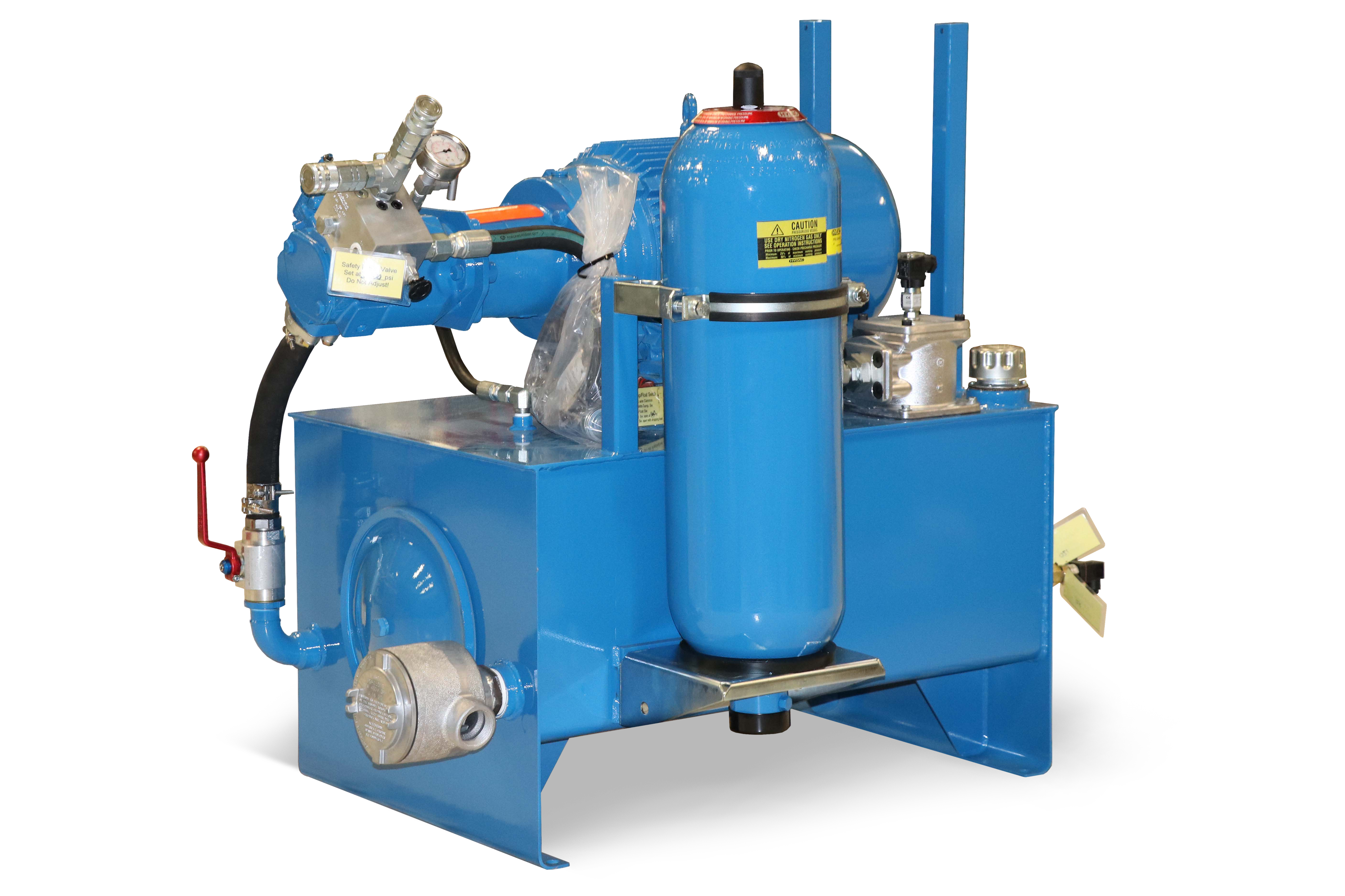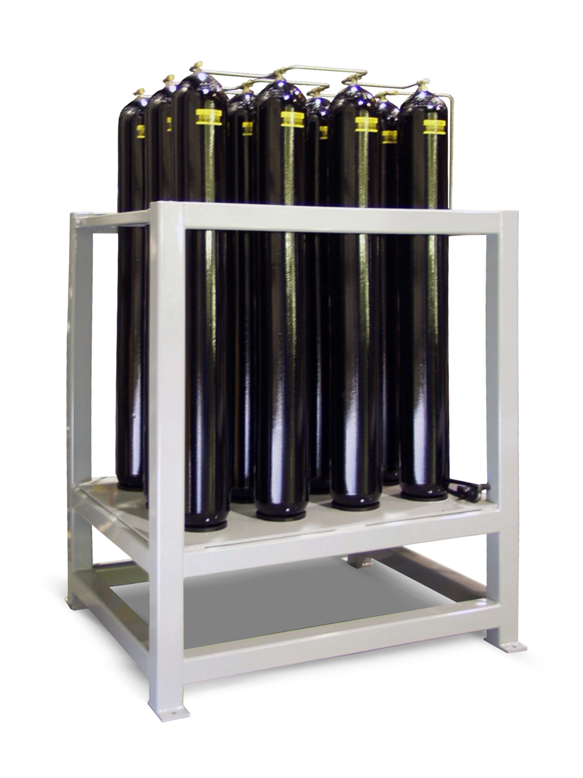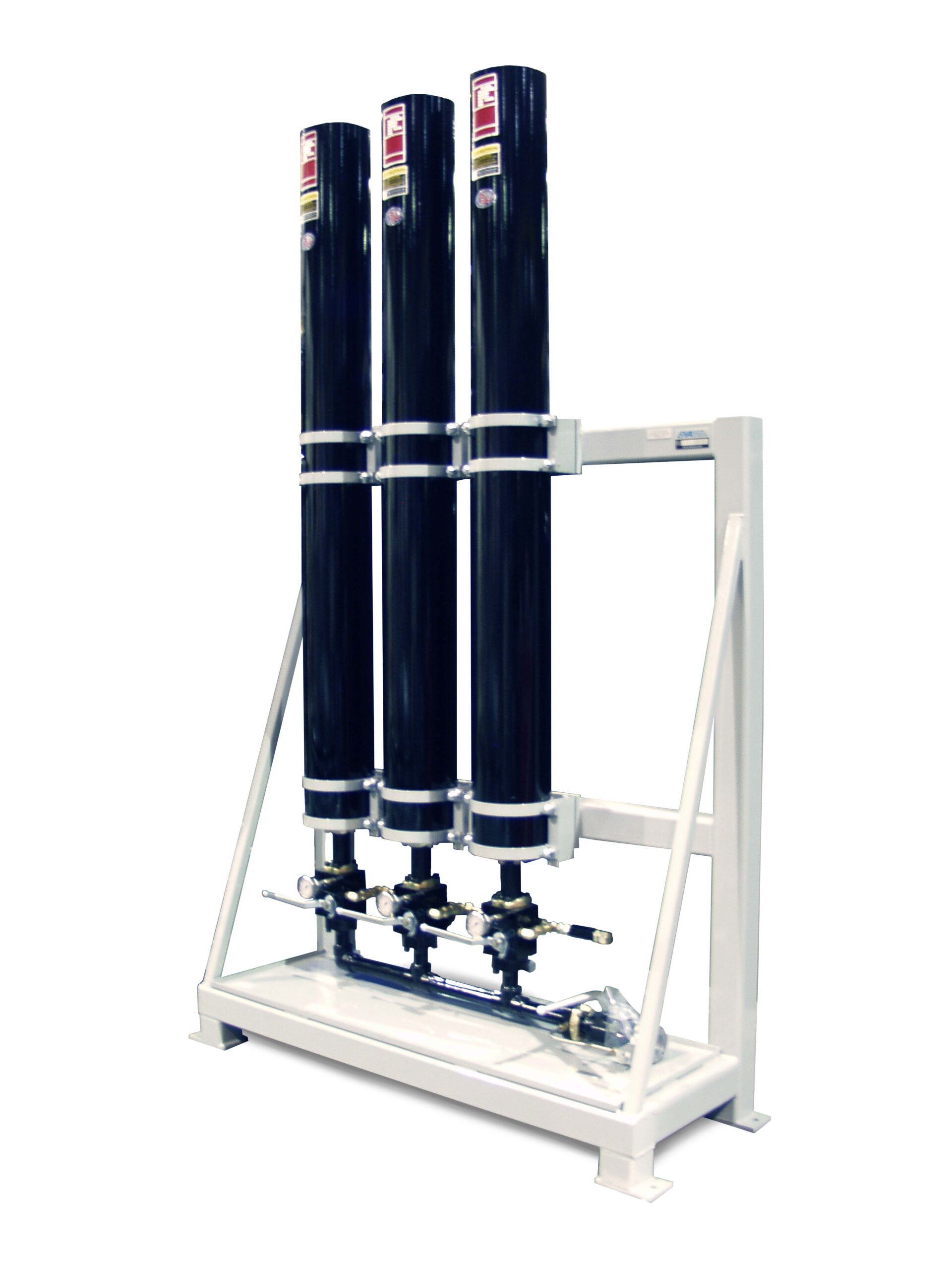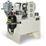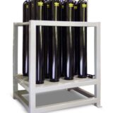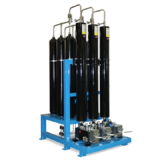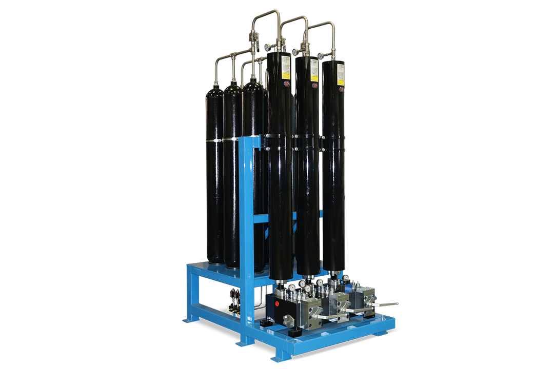 Accumulator racks tie individual accumulators with individual shutoffs to a common header, gas connection, and optional automatic bleed down function. Accumulator racks can be made of bladder or piston type accumulators. Typical accumulator volumes range from 5 to 30 gallons per accumulator and racks can range in size from one to 12 accumulators per rack. However, multiple racks can be combined to form larger systems.