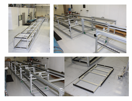 Conveyor Assembly EHA builds 50’ Manual Conveyor with 5’ Transfer Cart and Pallet Return Rails EHA designed and built a 50′ manual conveyor system using Bosch Framing and MPS (Manual Production System) featuring a two-rail set-up with easy-rolling side-guided rollers, axles, and roller holders. The system includes three pallet stops (2 manual and1 automated), a 5-foot transfer cart, and a gravity feed return rail. When the transfer cart is moved to the back rail, a spring-activated pallet stop prevents the pallets from falling off the return rails. The manual pallet stops can be operated from either side. The system was designed and built at EHA. Also featured are custom, adjustable-length pallet configurations per the customer’s specs. After visiting EHA for a test approval, the system was shipped to the factory for assembly and installation.