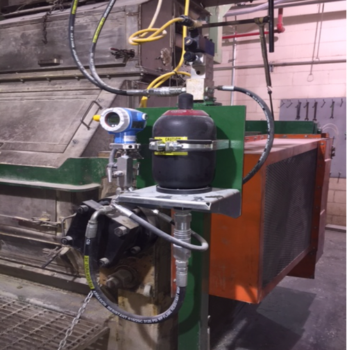 Roll Pressure Controls Hydraulics EHA updates hydraulics on roll pressure controls EHA replaced the directional control and pressure reducing valves in this system. Additionally, we added the stand, accumulator, pressure transducer, quick disconnect, and plumbing. The equipment processes soybeans by crushing the product between two rollers. The hydraulic cylinders maintains the correct pressure on the adjustable roll. There is a cylinder at each end of the adjustable roll. Occasionally foreign material like a rock or tool will fall in between the rollers and the pressure reducing valve can’t react quick enough which would break the roll mounts. The accumulator was added to take that quick burst of oil, reducing the risk of breakage. There were 9 machines in line, for a total of 18 systems. While the machines were down for replumbing, we also rebuilt all 18 cylinders.